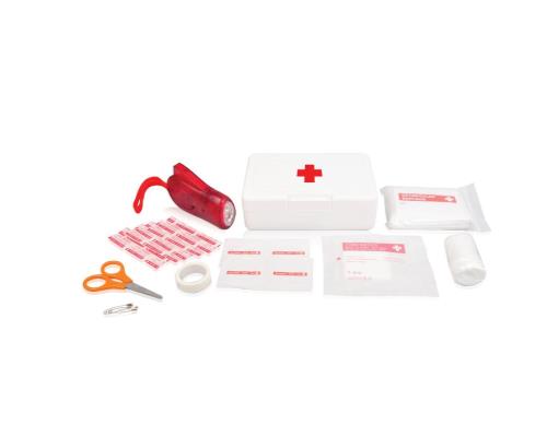 Plastic box, including 5 non-woven pads in a paper bag, 5 plasters, 4 alcohol pads, a pair of scissors, a PBT bandage, a triangular bandage, 2 pins, a paper tape, a hand-pressing torch, EN13485:2003 compliant