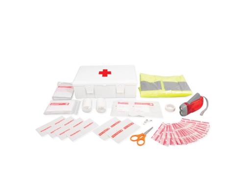 Plastic box, including 10 non-woven pads in 2 paper bags, 15 plasters, 8 alcohol pads, 4 moist towelettes, 2 PBT bandages, a triangular bandage, 2 pins, a paper tape, a pair of scissors, a hand-pressing torch, an emergency blanket, a EN471 compliant reflective vest, EN13485:2003 compliant