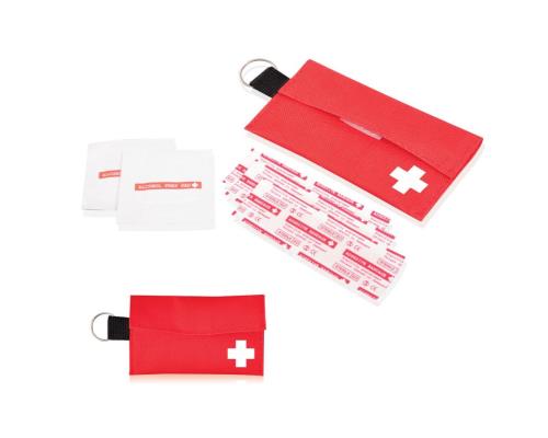 Polyester pouch with key chain, including 3 plasters, 2 alcohol pads, EN13485:2003 compliant